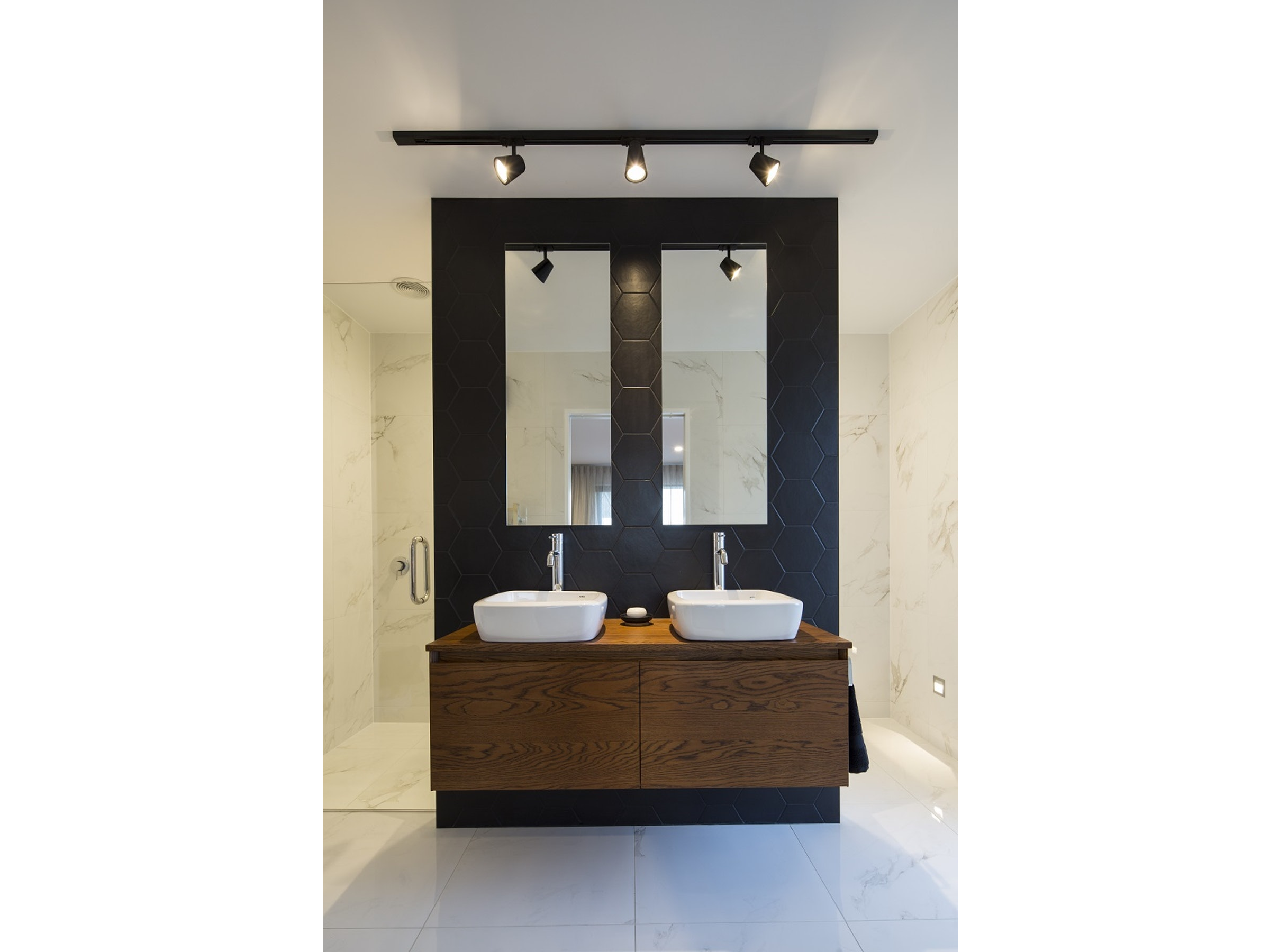 The ensuite looks amazing with Newtech's Ravani solid timber vanity in American Walnut topped with two Eos square vessel basins.
