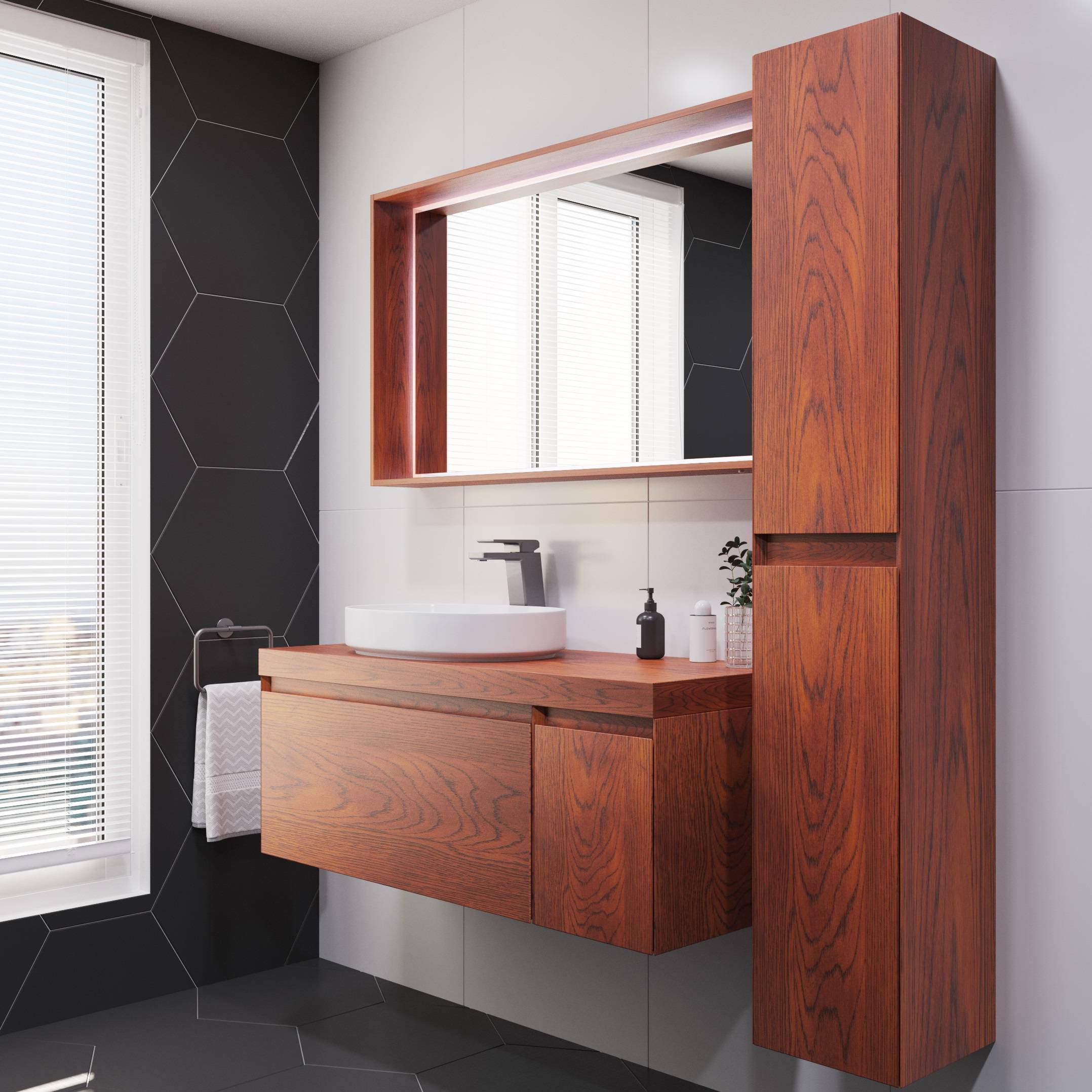 Having a compact vanity unit can help to reduce your clutter, as it boasts more storage capacity than the traditional hand basin. We think the wall hung design strikes a nice balance between a handy amount of storage and an open feel for a smaller space. If do you require more storage and your space allows it, consider a thin-line mirror cabinet to store your cosmetics and other must-have items conveniently out of sight.
