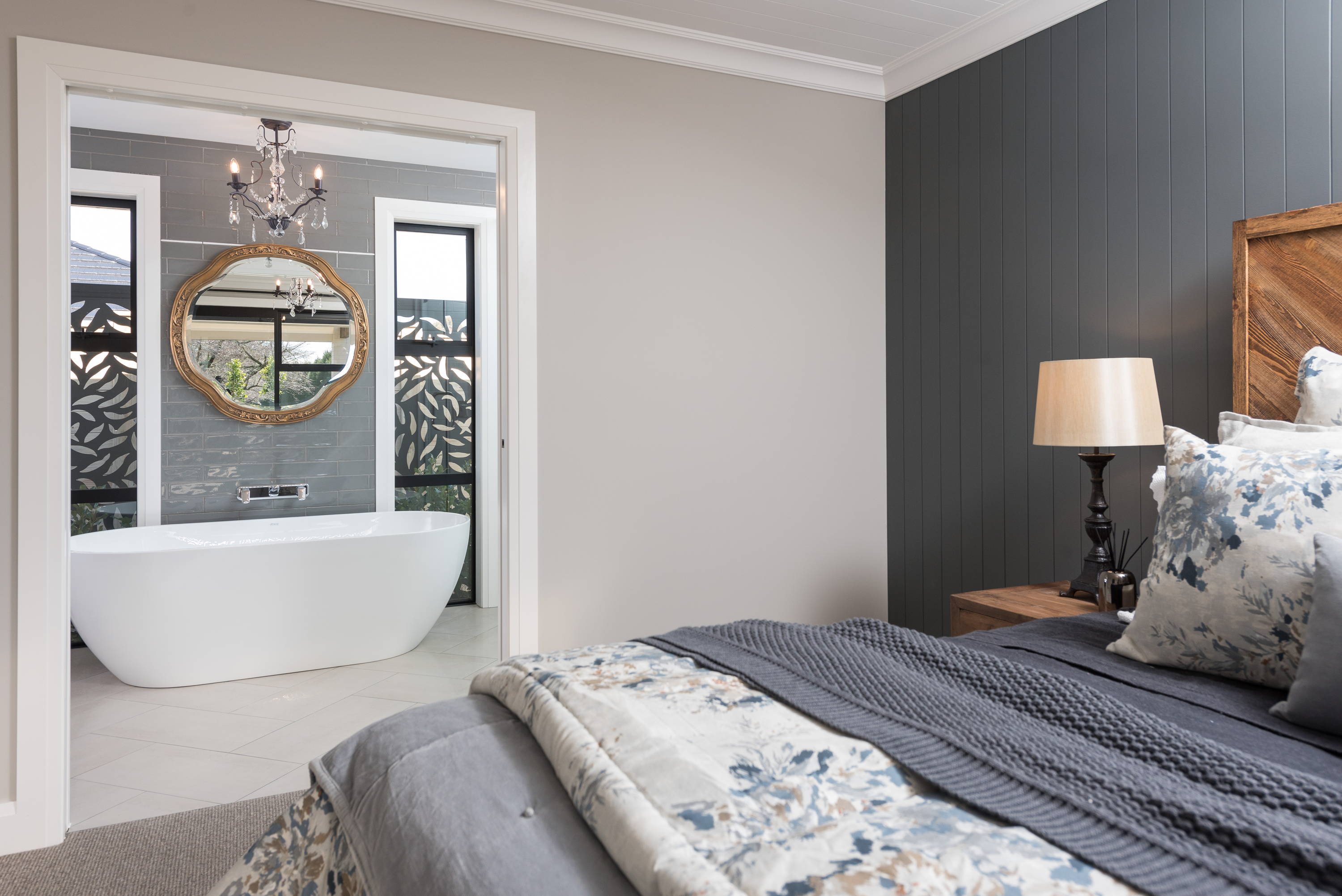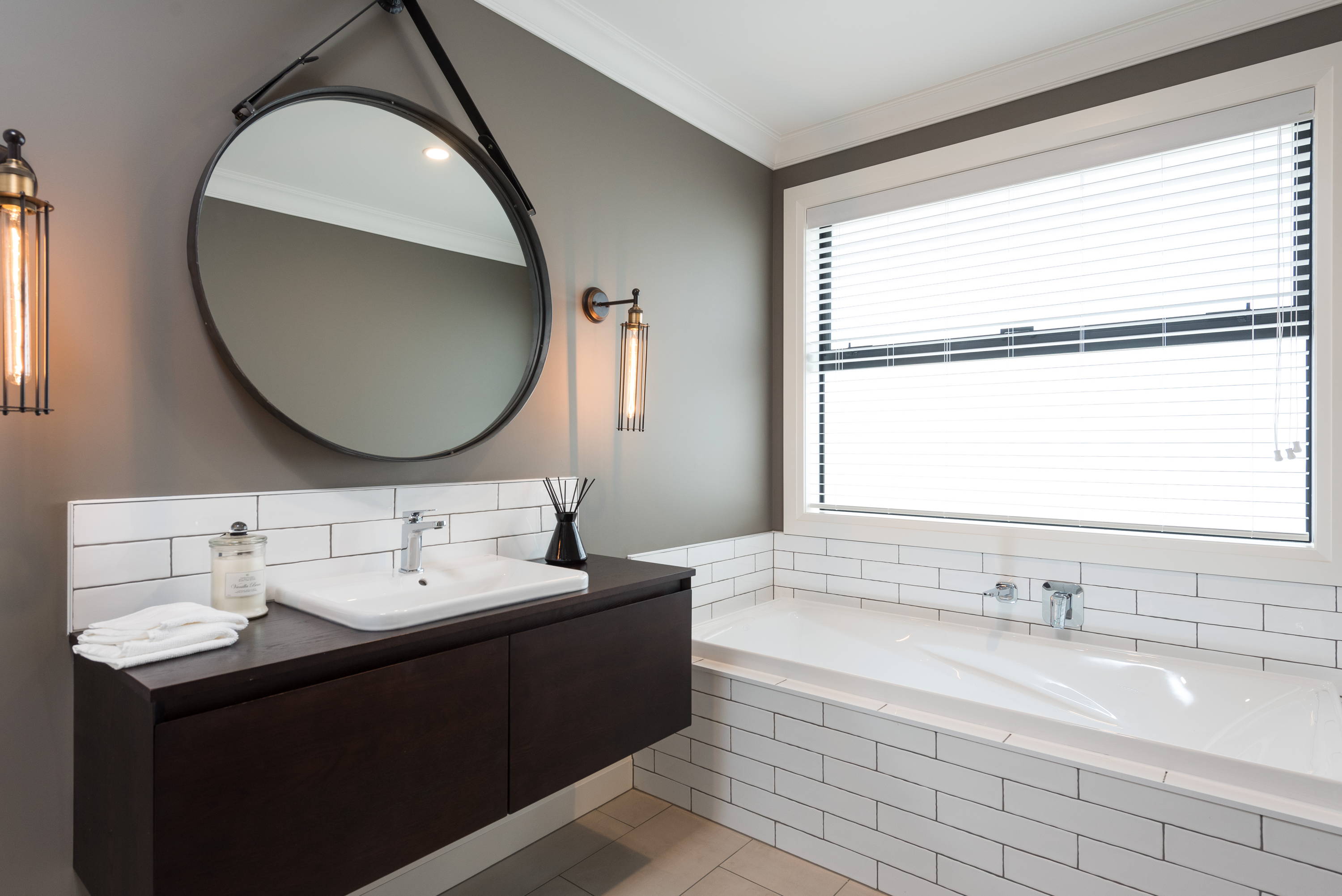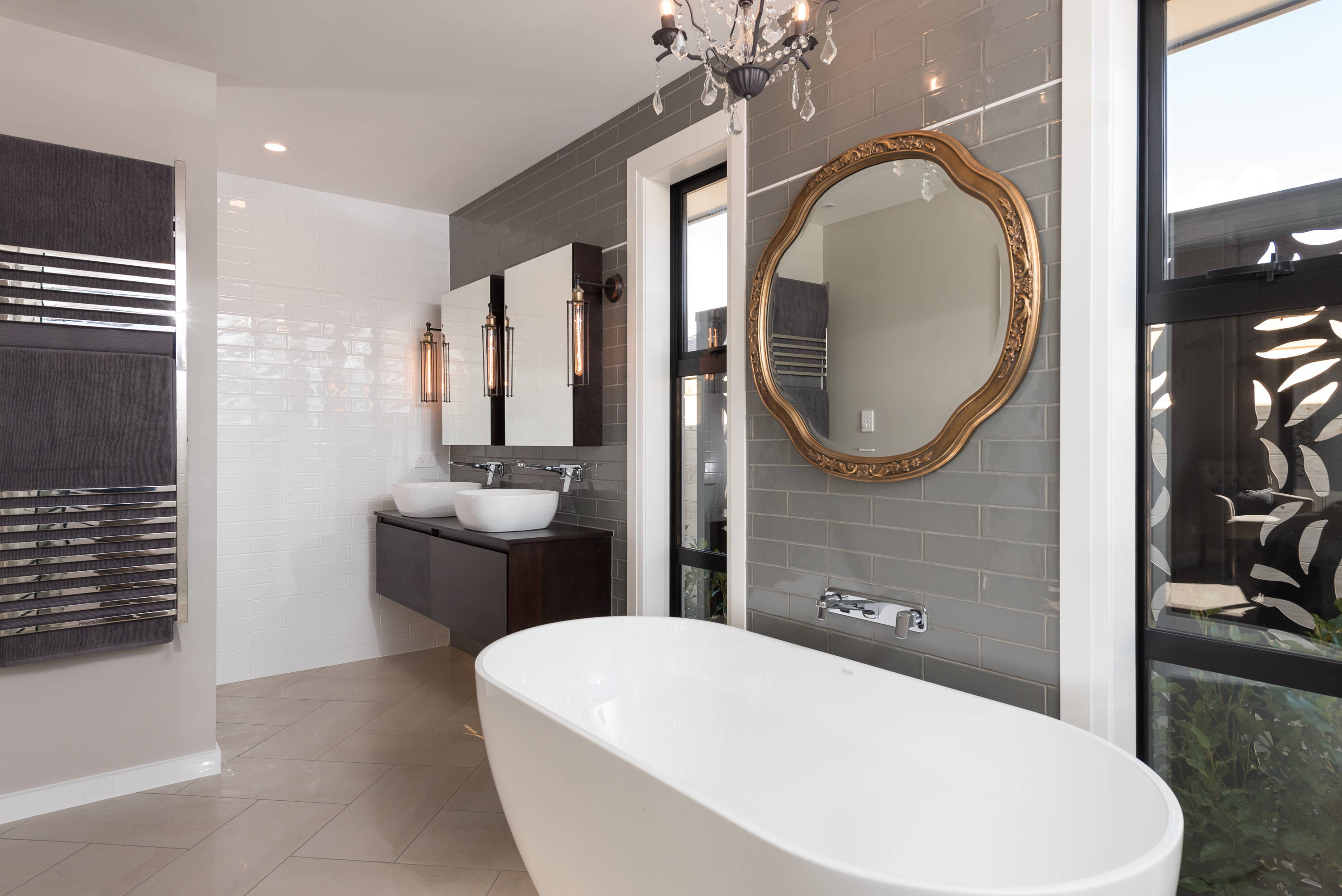 This beautiful Tauranga home uses dark chocolately colours throughout their bathrooms creating a quality, homely mood. We love the matching accents on the mirrors and lights which draws out the colour in the Dark Oak vanity.