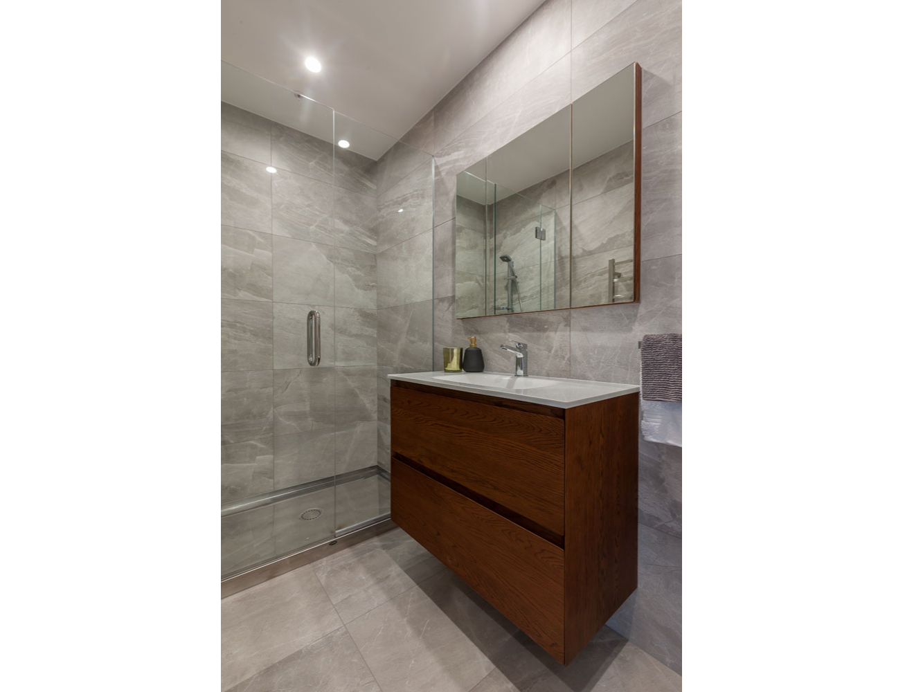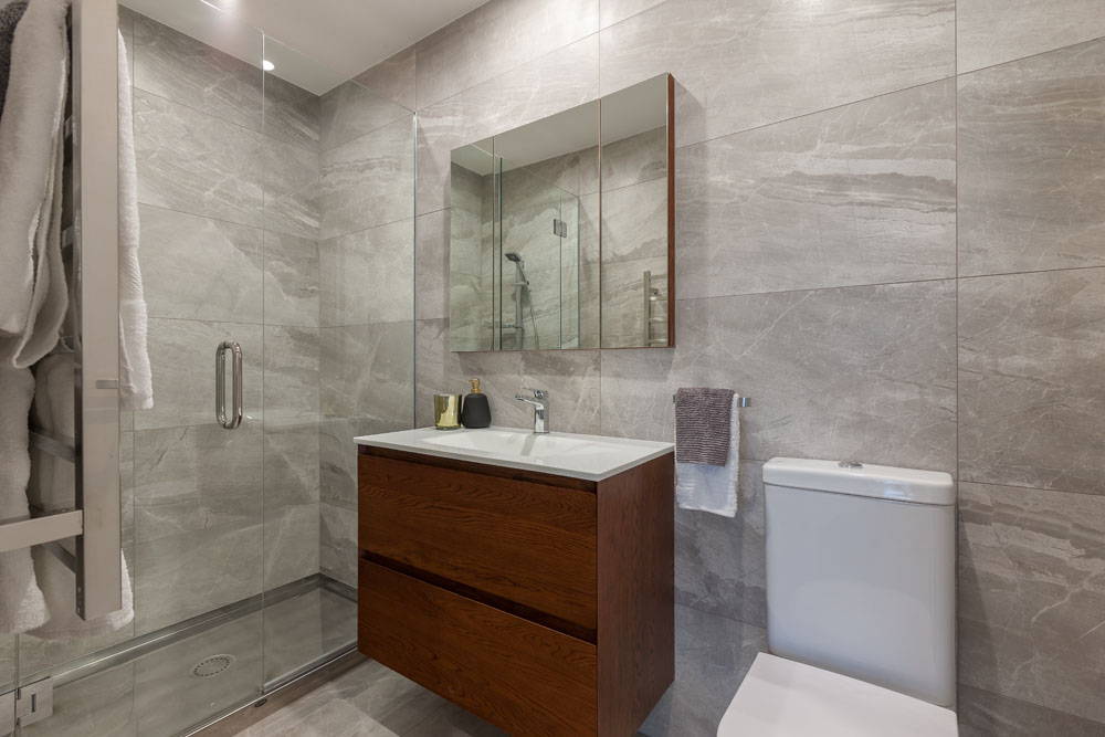 Featuring the Newtech Kolum Vanity in American Walnut, with a matching Mirror Cabinet, Castello toilet, and towel rail. The bathroom is beautifully tiled to accentuate the feeling of class throughout.